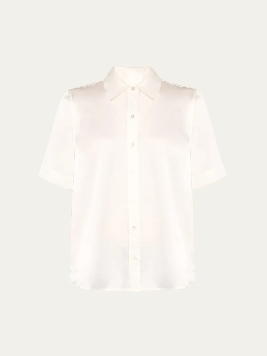 L'Agence "Ellah" flattering blouse crafted from lustrous silk charmeuse Approx. 25.8"L from shoulder to hem Spread collar; button front Cuffed elbow-length sleeves Yoked back Hip length Relaxed fit Silk Dry clean Imported Model is 5'10"/177cm. Online Inquiries: BGS21_T5RFU| Store Inquiries: #4797605