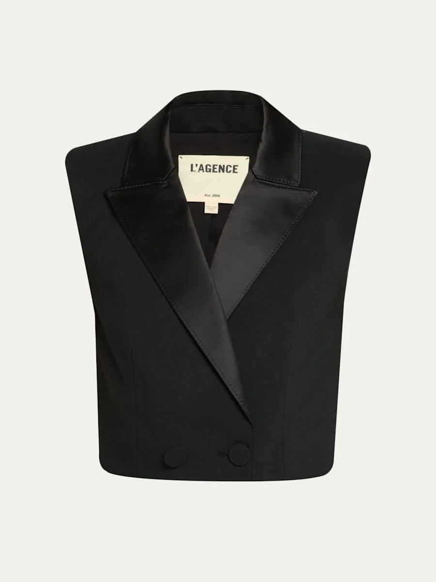 A feminine take on a classic tuxedo vest, L'Agence's "Hollis" is designed in stretch suiting with contrasting satin lapels Approx. 18.3"L from shoulder to hem Peak lapels; double-breasted front Strong shoulders Sleeveless Tailored fit Cropped hem Polyester/viscose/spandex Dry clean Imported Online Inquiries: BGS21_T6UAM| Store Inquiries: #5037363