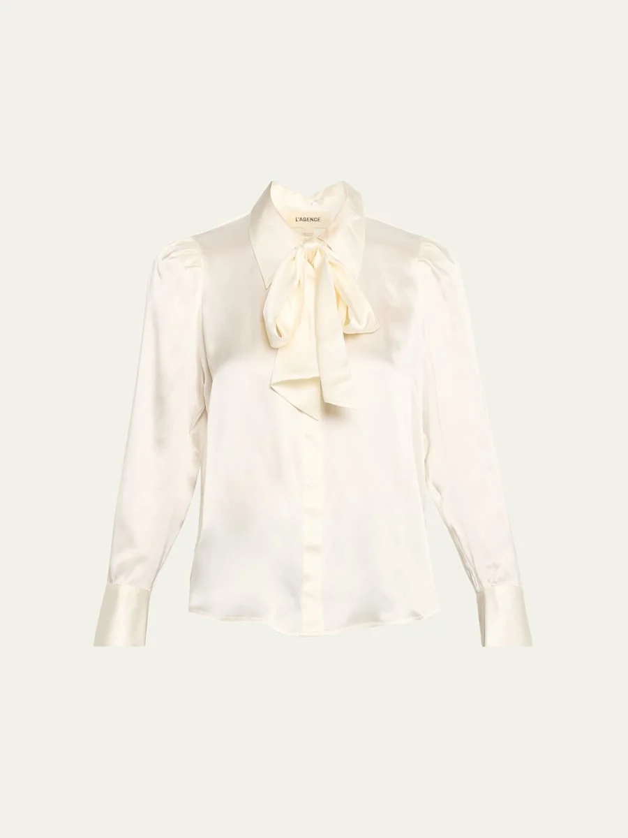 Crafted from lightweight silk charmeuse, the "Honey" blouse by L'Agence is finished with a selftie neck that can be worn as a tie or a bow Approx. 24.6"L from shoulder to hem Pointed collar; concealed button front Long sleeves; button cuffs Pleated back yoke Relaxed fit Hip length Silk Dry clean Imported