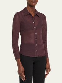 Featuring a classic buttonfront silhouete, the "Indiana" blouse by L'Agence is crafted in sheer mesh with endless styling opportunities. Point collar; buttonfront Bracelet sleeves with button cuffs Fitted silhouette Hem sits at the hip Polyester/Lycra xfit® spandex Dry clean Imported