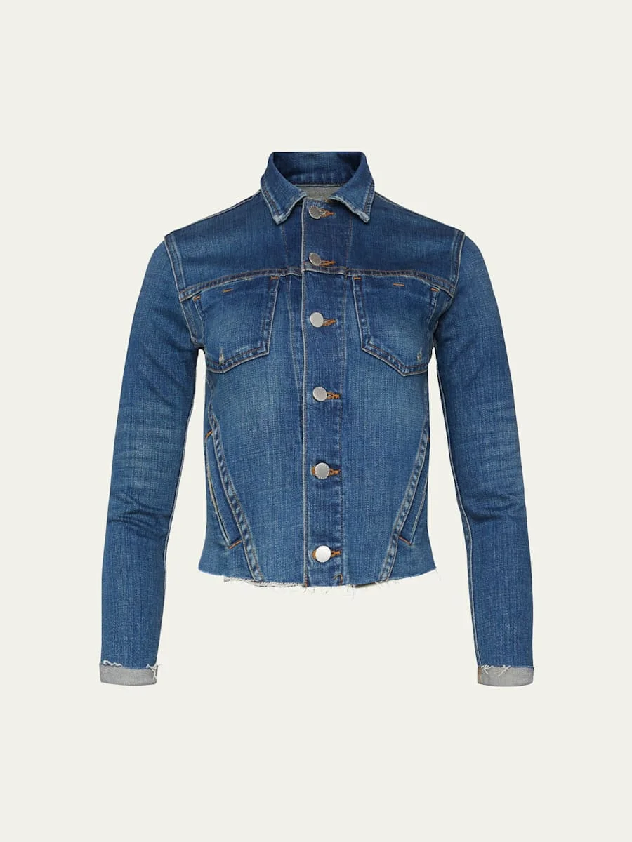 L'Agence "Janelle" denim jacket. Approx. 20.5"L from shoulder to hem. Spread collar; button front. Long sleeves. Chest patch pockets. Side welt pockets. Slim fit. Raw-edge hem. Cotton/polyester/spandex. Unlined. Machine wash. Made in USA of imported material. Online Inquiries: BGS21_T27Q5| Store Inquiries: #2873820