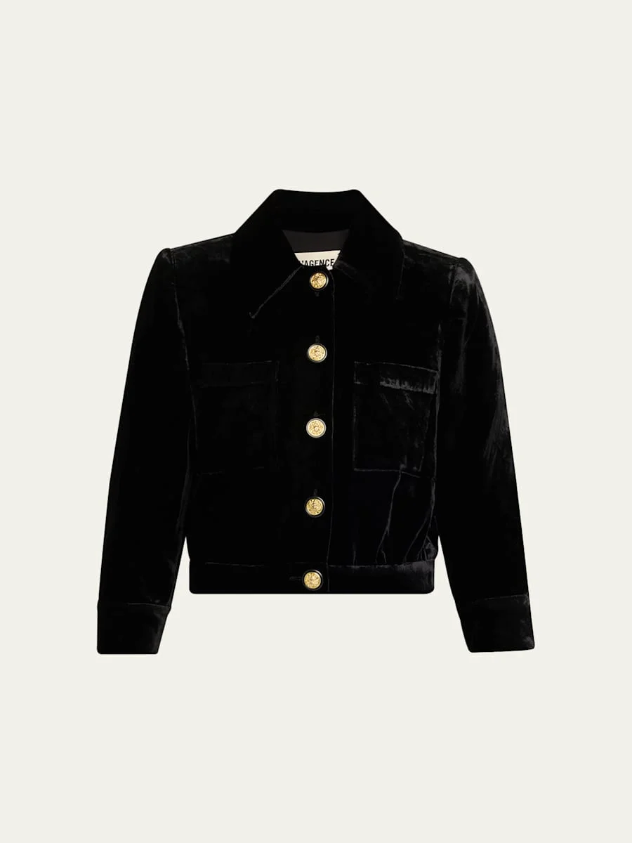 Complete with decorative gold buttons, the "Jia" jacket by L'Agence is crafted from plush velvet in a tailored silhouette Approx. 19.5"L from shoulder to hem Pointed collar; button front 3/4 sleeves; button cuffs Chest patch pockets Yoked back Cropped length Viscose/silk Dry clean Imported
