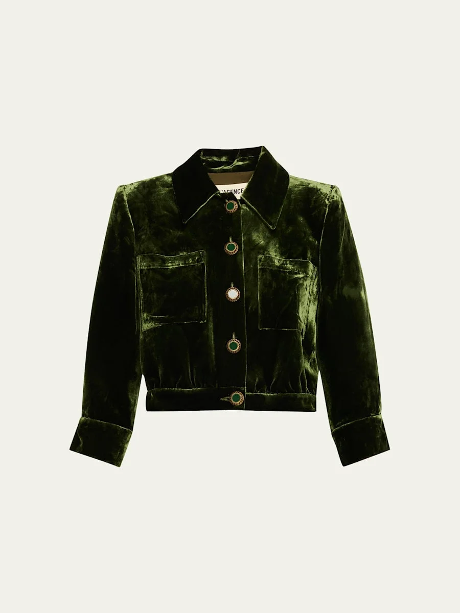Complete with decorative gold buttons, the "Jia" jacket by L'Agence is crafted from plush velvet in a tailored silhouette Approx. 19.5"L from shoulder to hem Pointed collar; button front 3/4 sleeves; button cuffs Chest patch pockets Yoked back Cropped length Viscose/silk Dry clean Imported
