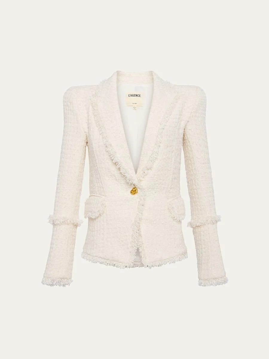 Complete with frayed trim and novelty buttons, the "Kaisley" blazer by L'Agence is crafted in waffle tweed Peak lapels; single-button front Strong padded shoulders Long sleeves; button cuffs Front flap pockets Hip length Flattering cinched fit Polyester Lining: Polyester Dry clean Imported Online Inquiries: BGS21_T6FC1| Store Inquiries: #4974958