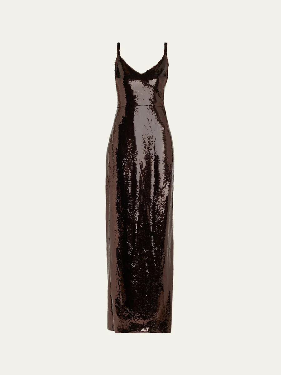 A sparkling statement piece, the "Karma" maxi dress by L'Agence is embellished with overlapping sequins V neckline Sleeveless Center-cut back vent eases movement Full length Body-skimming fit Column silhouette Invisible back zipper Polyester Imported Online Inquiries: BGS21_T7R3W| Store Inquiries: #5193872
