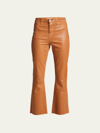 L'Agence "Kendra" jeans in coated stretch denim Approx. 26" inseam High rise Fivepocket style Fitted through hip; flared from knee Cropped fit Rawedge hem Button/zip fly; belt loops Cotton/elastane/spandex Made in USA