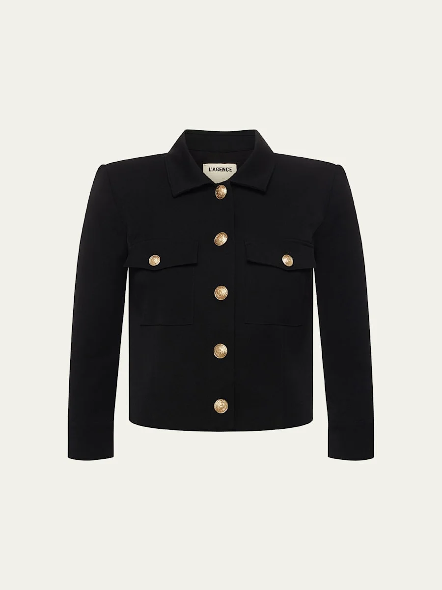 L'Agence "Kumi" jacket crafted from a supple stretch-suiting fabrication and finished with signature golden embossed-dome buttons Spread collar; button front Strong shoulders Dual button-flap pockets 3/4 sleeves with button cuffs Cropped hem Fitted Polyester/spandex Imported Model is 5'10"/177cm. Size Note: Item runs small, consider ordering a size up. Online Inquiries: BGS21_T5RAV| Store Inquiries: #4796420