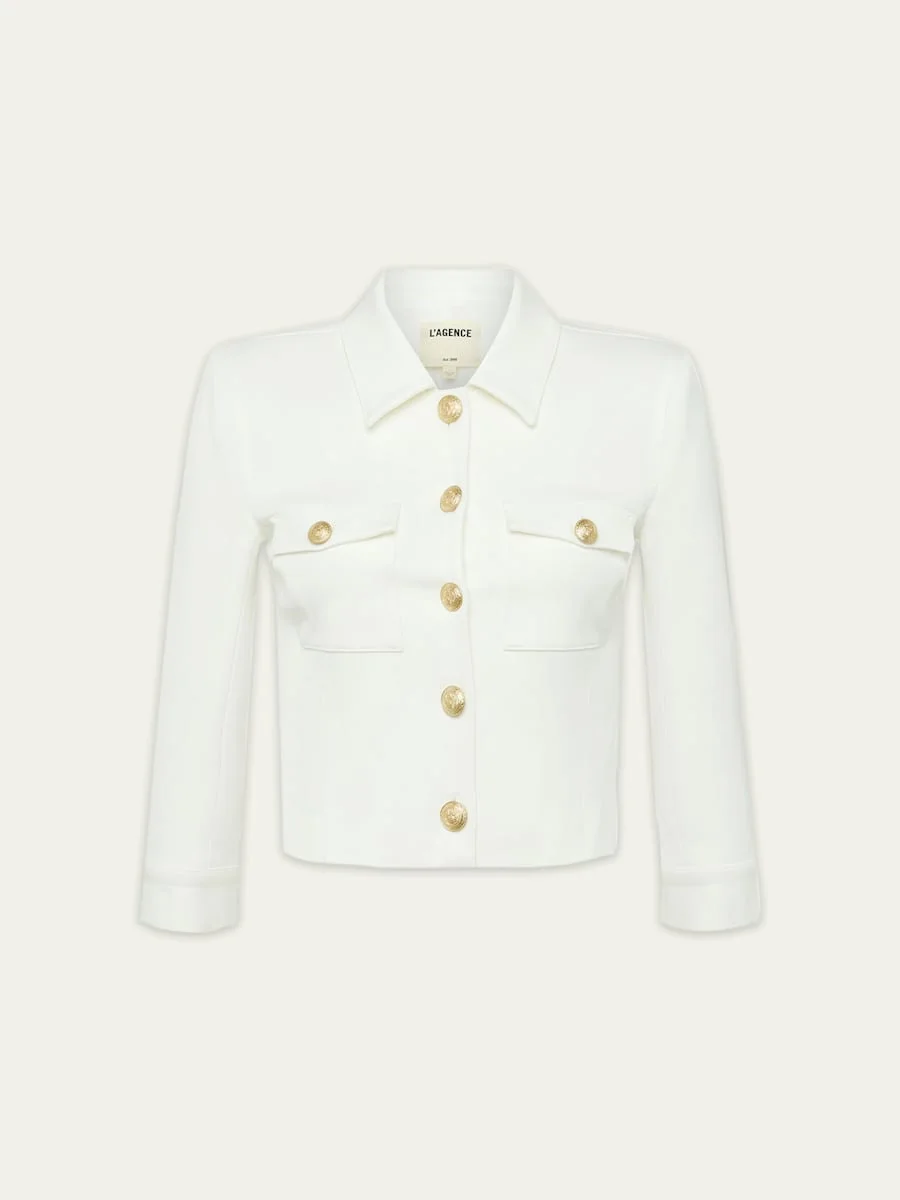 L'Agence "Kumi" jacket crafted from a supple stretch-suiting fabrication and finished with signature golden embossed-dome buttons Spread collar; button front Strong shoulders Dual button-flap pockets 3/4 sleeves with button cuffs Cropped hem Fitted Polyester/spandex Imported Model is 5'10"/177cm. Online Inquiries: BGS21_T5RAV| Store Inquiries: #4796420