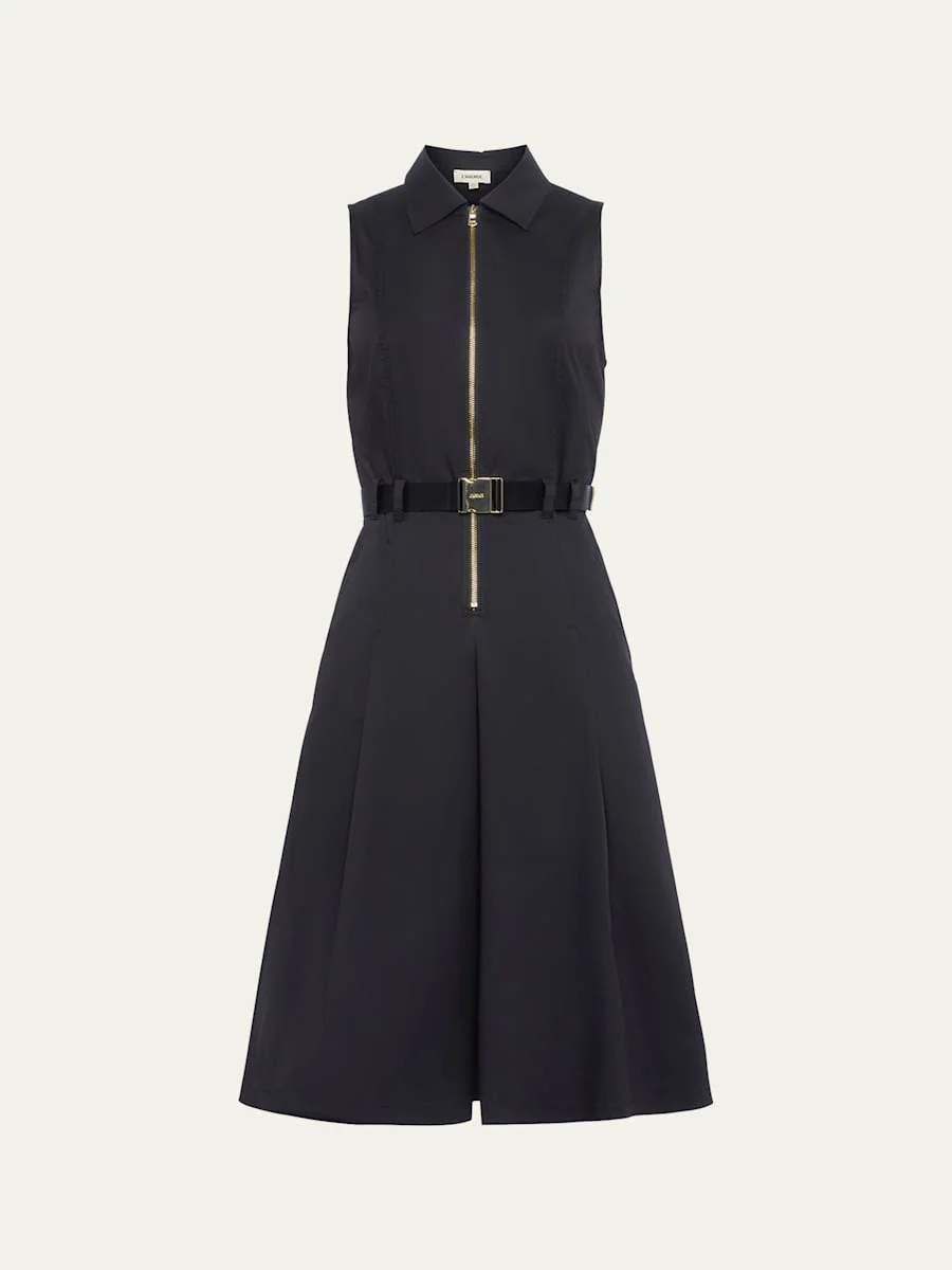 L'Agence "Kylo" structured shirtdress complete with goldtone hardware and a pleated skirt Spread collar; partial front zip Sleeveless Removable buckle belt Hem hits around the knee A-line silhouette Cotton/nylon/polyamide/spandex Lining: Polyester Dry clean Imported Online Inquiries: BGS21_T6FBZ| Store Inquiries: #4974956