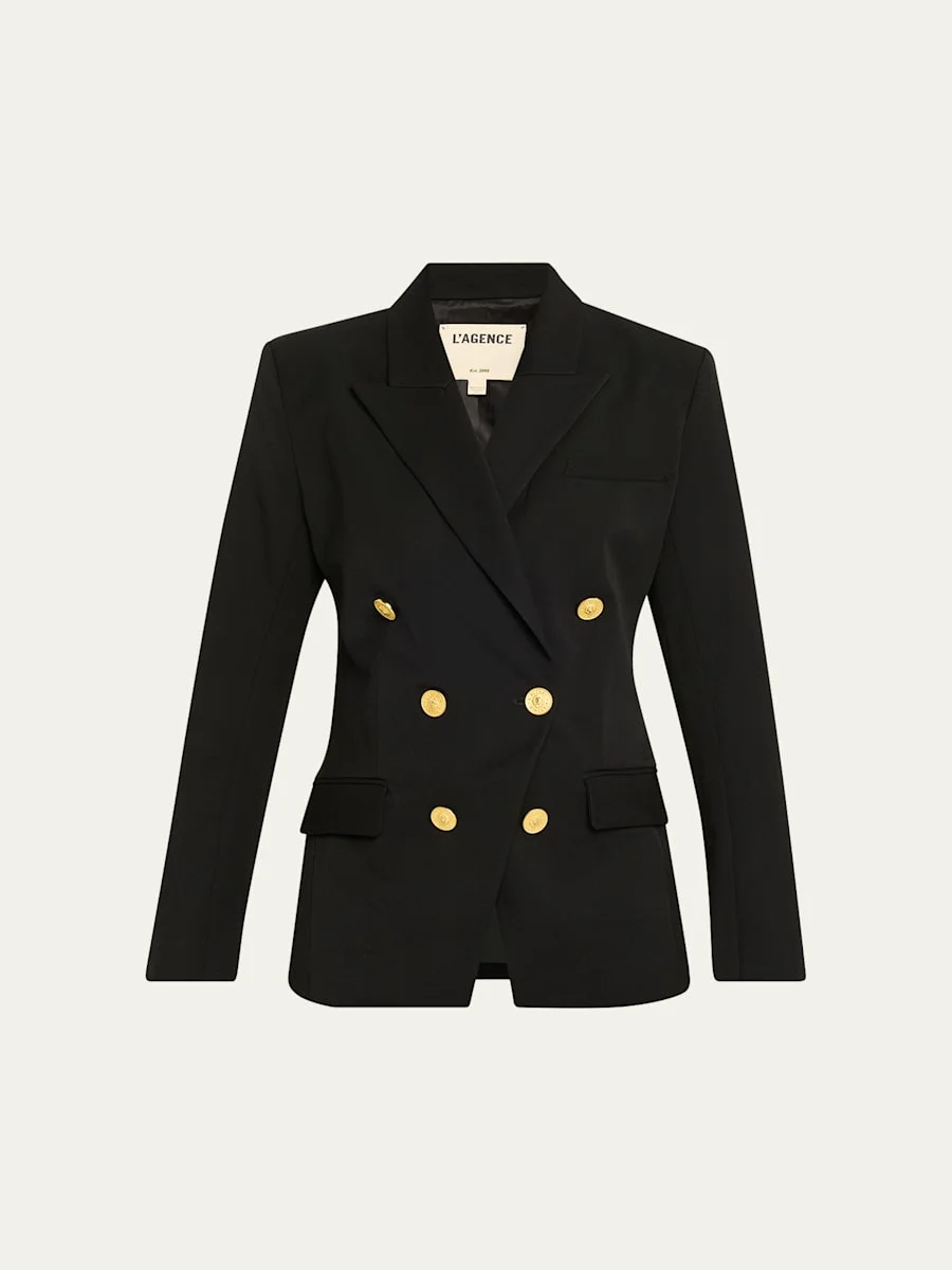 Designed in stretch suiting fabric, the "Kyomi" tailored blazer by L'Agence features a nippedin waist for a figuredefining silhouette Approx. 27.5"L from shoulder to hem Peak lapels; doublebreasted front Padded shoulders Long sleeves; button cuffs Single chest welt pockets Hip flap pockets Midlength Polyester/Proviscose® rayon/spandex Dry clean Imported