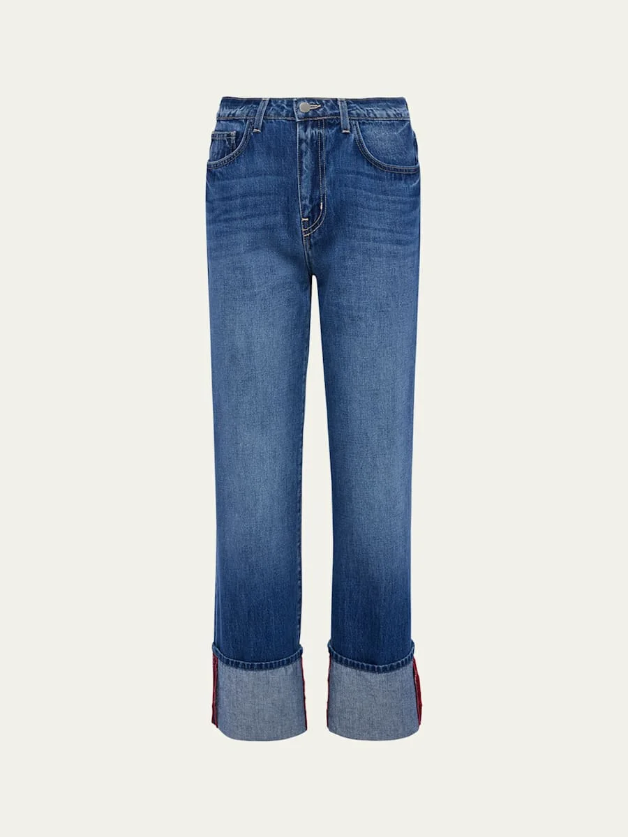 L'Agence "Leighton" stovepipe jeans featuring a cuffed hem in mediumwash denim Approx. 26" inseam Ultrahigh rise Fivepocket style Straight legs Cropped length Button/zip fly; belt loops Cotton Made in USA