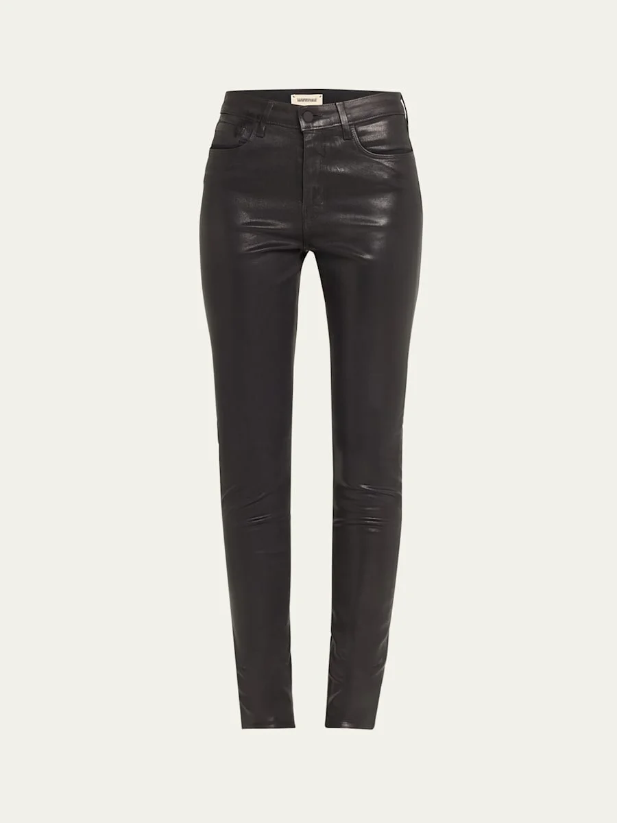 L'Agence "Marguerite" coated jeans. Approx. measurements: 9.25" rise; 30" inseam; 9.5" leg opening. High-rise. Five-pocket style. Fitted through skinny legs. Ankle length. Button/zip fly; belt loops. Modal/cotton/polyester/spandex. Made in USA of imported material. Online Inquiries: BGS21_TXC44| Store Inquiries: #2714441