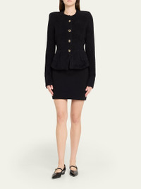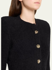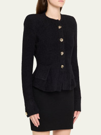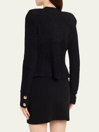 Spun in a textured knit, the "Melissa" cardigan by L'Agence boasts an elegant sculpted waist and flared hem for a figure-defining silhouette Crew neckline; button front Padded shoulders Long sleeves; button cuffs Hip patch pockets Slim fit Hip length Amni® nylon/Lycra xfit® spandex Imported Online Inquiries: BGS21_T7H03| Store Inquiries: #5164623