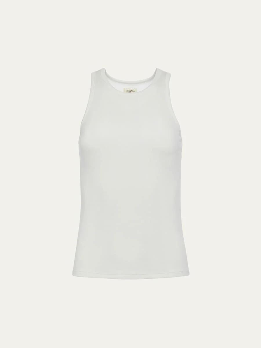 L'Agence "Nia" racer back tank Approx. 23"L from shoulder to hem Crew neckline Sleeveless Pullover style Modal/spandex Made in USA Model is 5'10"/177cm. Online Inquiries: BGS21_T2ULJ| Store Inquiries: #4239682