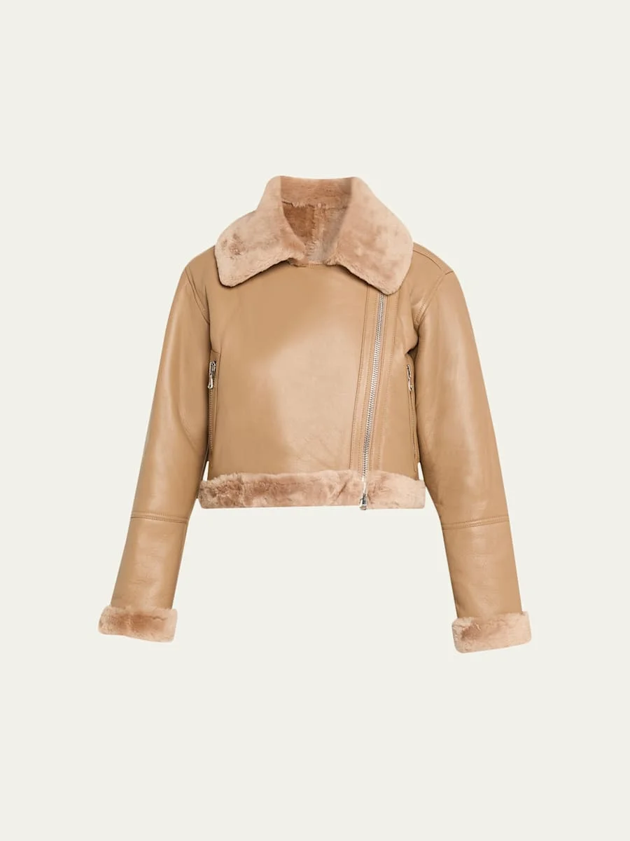 Pike Cropped Lambskin Leather Jacket with Shearling Trim