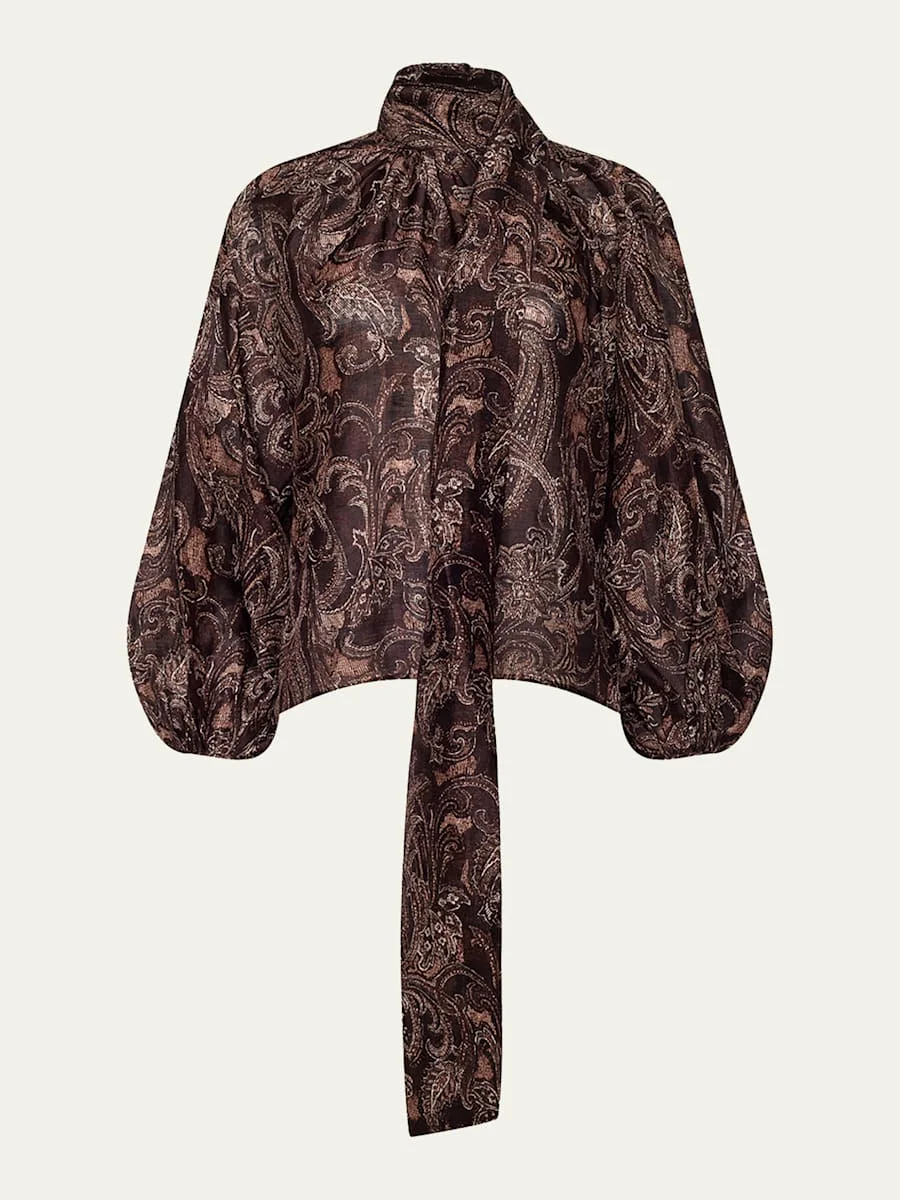 L'Agence's "Rhett" blouse is crafted from lightweight linensilk organza with an etched paisley print Approx. 23.6"L from shoulder to hem High selftie neckline Long flowy bell sleeves Oversized fit Hip length Invisible zip closure Linen/silk Dry clean Imported