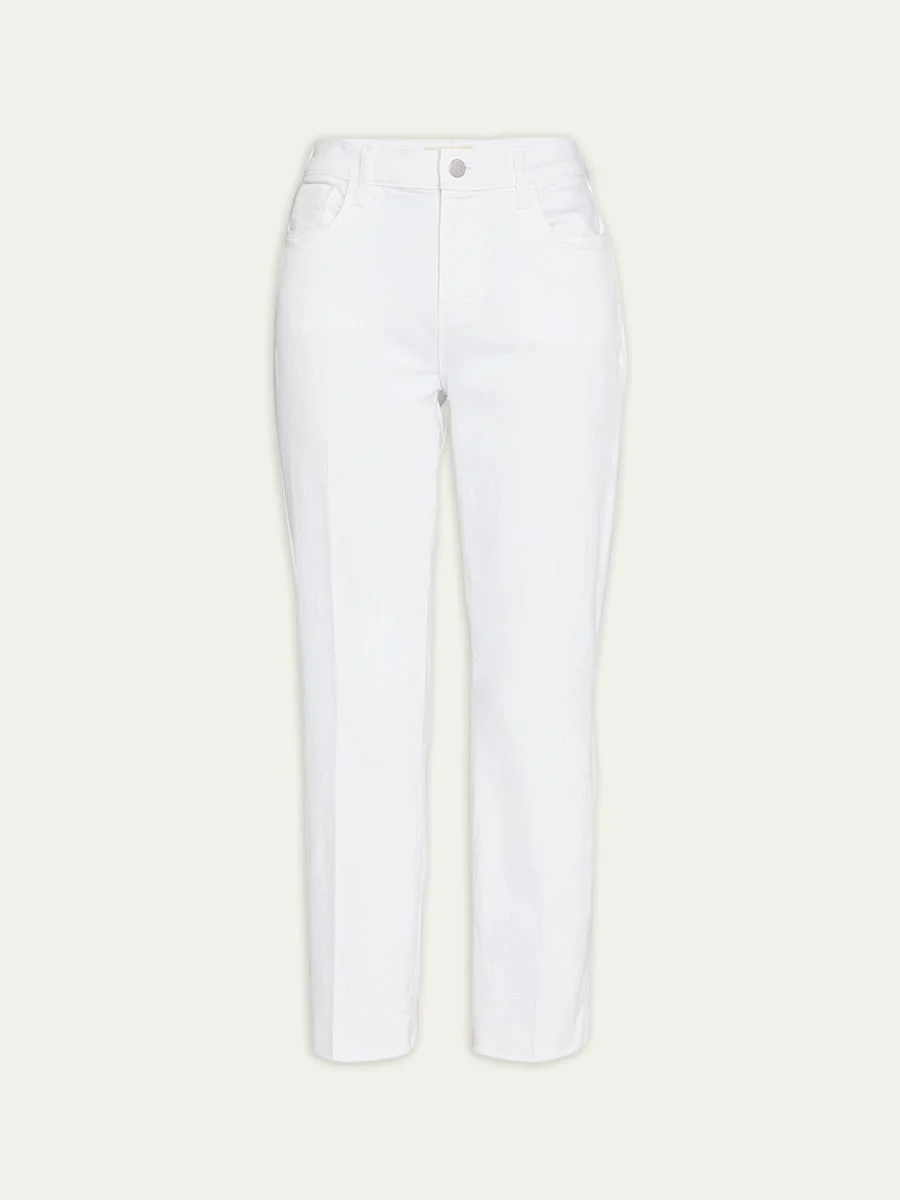 L'Agence "Sada" denim jeans with minimal stretch. Approx. 26" inseam. High-rise. Five-pocket style. Slim fit; straight legs. Cropped above the ankle. Fraying at hem. Button/zip fly; belt loops. Cotton/polyester/spandex. Made in USA of imported material. Online Inquiries: BGS21_T11KJ| Store Inquiries: #3119670