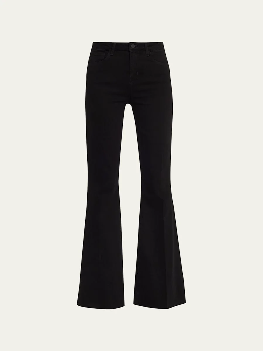 L'Agence "Sera" flared-leg jeans with a raw hem in black stretch-denim Five-pocket style High rise Fitted through hip; flared from knee Full length Button/zip fly; belt loops Cotton/polyester/spandex Made in USA Model is 5'10"/177cm. Online Inquiries: BGS21_T51EC| Store Inquiries: #4614934