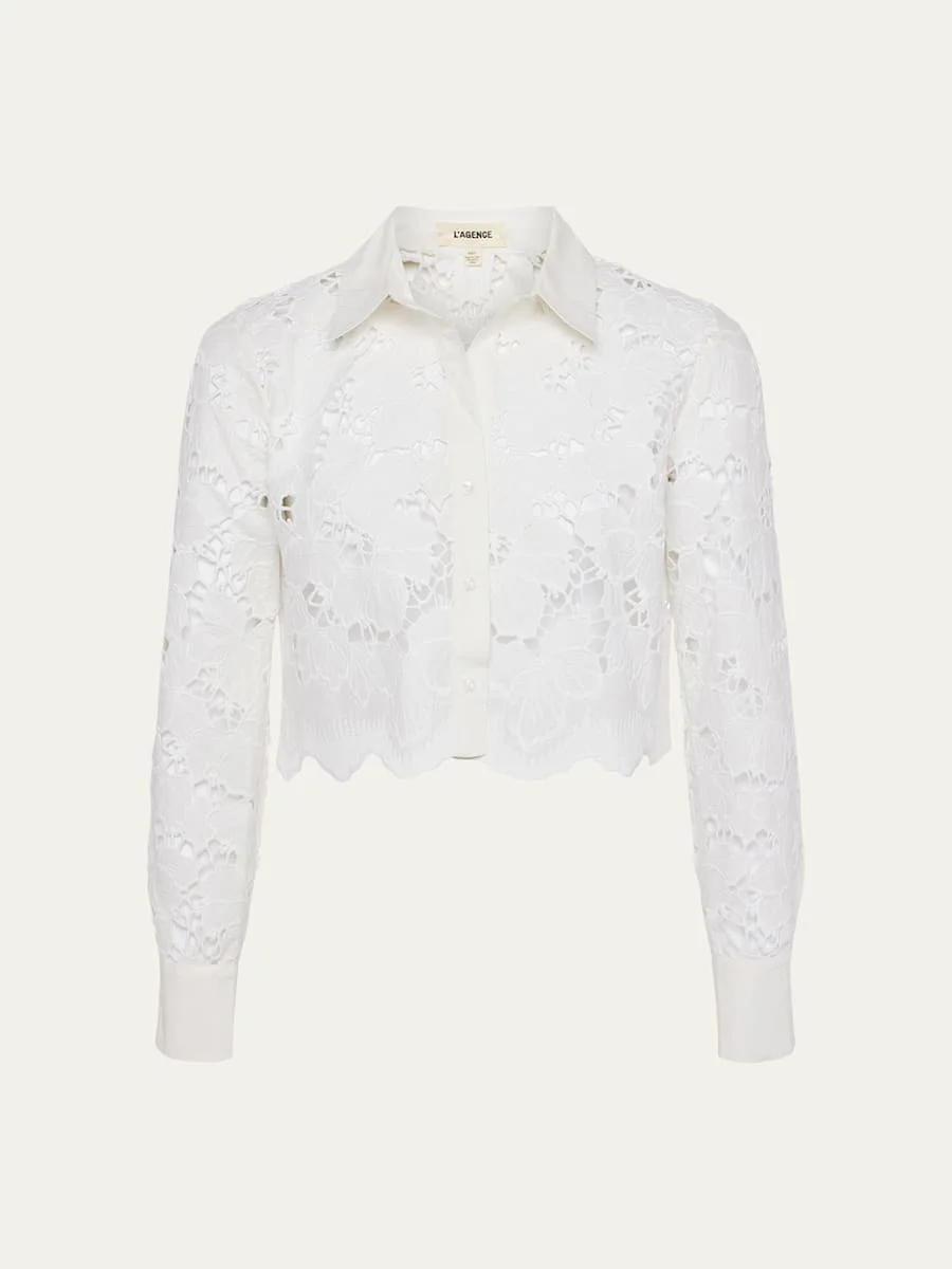 L'Agence "Seychelle" shirt in a floral eyelet-embroidered construction Approx. 19"L from shoulder to hem Spread collar Button front Long sleeves with button cuffs; approx. 23.5"L Cropped length Relaxed fit Cotton Dry clean Imported Online Inquiries: BGS21_T5HZ4| Store Inquiries: #4730240