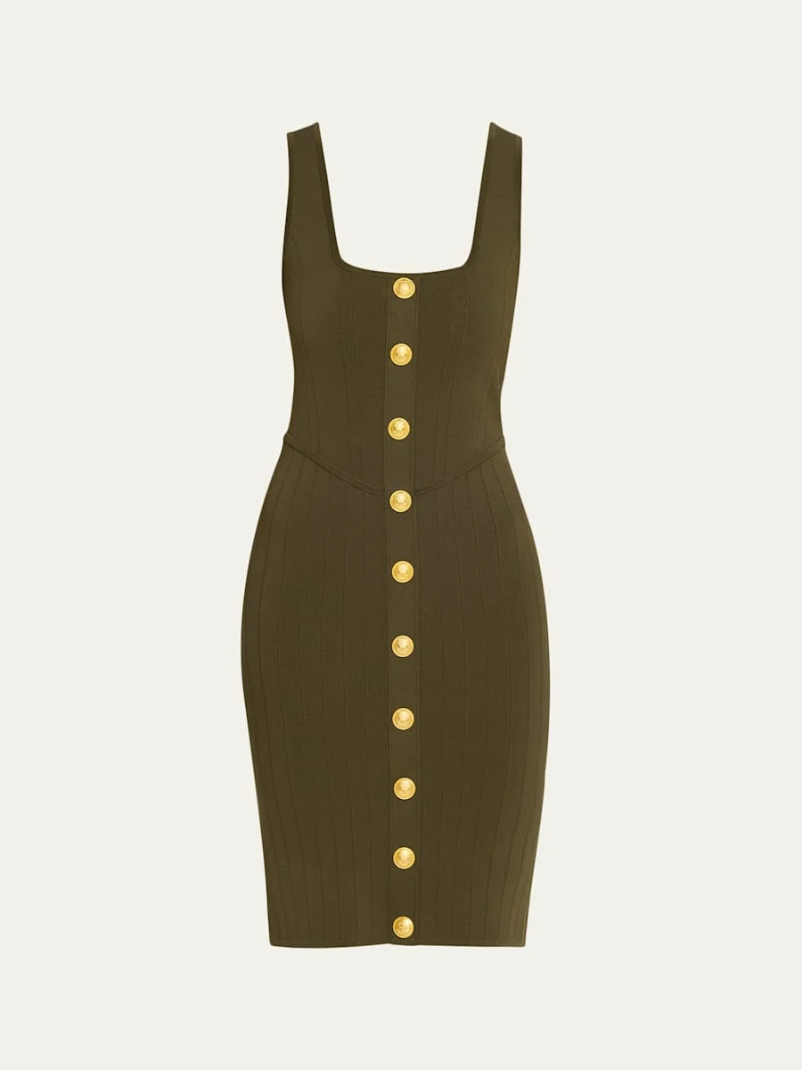 L'Agence "Soleil" knit midi dress finished with gold-tone buttons Square neckline Sleeveless Bodycon silhouette Hem hits around the knee Slipover style Promodal® rayon/Amni® nylon/spandex Made in USA Online Inquiries: BGS21_T6RKF| Store Inquiries: #5026418