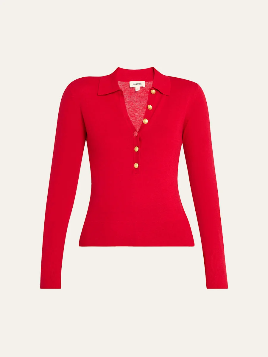 L'Agence "Sterling" button-front sweater with ribbed trim Point collar Long sleeves Slim fit Hem sits at the hip Pullover style Cotton/nylon/silk Imported Size Note: Item runs small, consider ordering a size up. Online Inquiries: BGS21_T4N7Z| Store Inquiries: #4530157