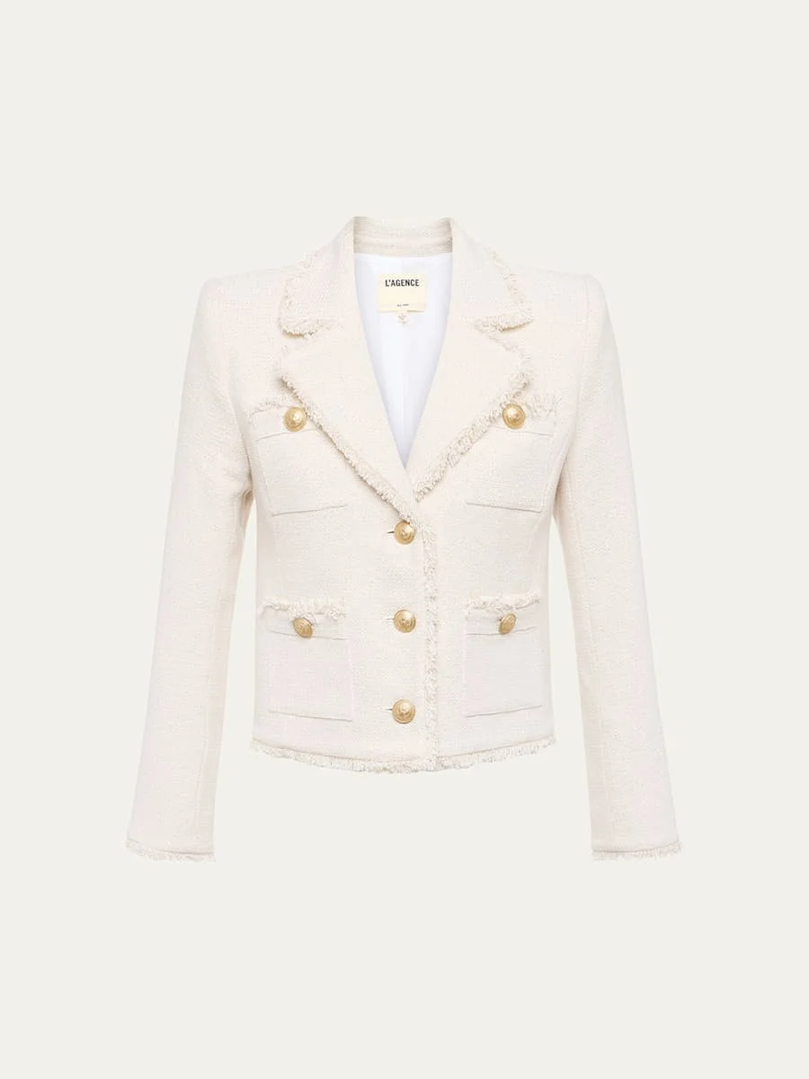 L'Agence "Sylvia" metallic tweed jacket with silvertone embossed-dome buttons and fringe finishes Approx. 21.3"L from shoulder to hem Notched lapels; single-breasted front Strong shoulders Long sleeves with button cuffs; approx. 23.4"L Front patch pockets Mid-length Relaxed fit Cotton/polyester Dry clean Imported Online Inquiries: BGS21_T5HZ7| Store Inquiries: #4730243