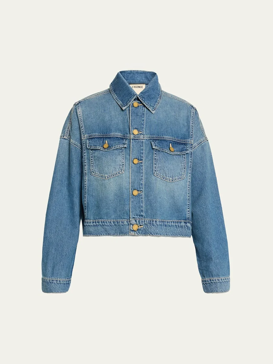 L'Agence "Vianney" classic denim jacket finished with a cropped highlow hem Spread collar Dropped shoulders Long sleeves with button cuffs Dual chest pockets Relaxed fit Buttonfront Cotton Machine wash cold Made in USA
