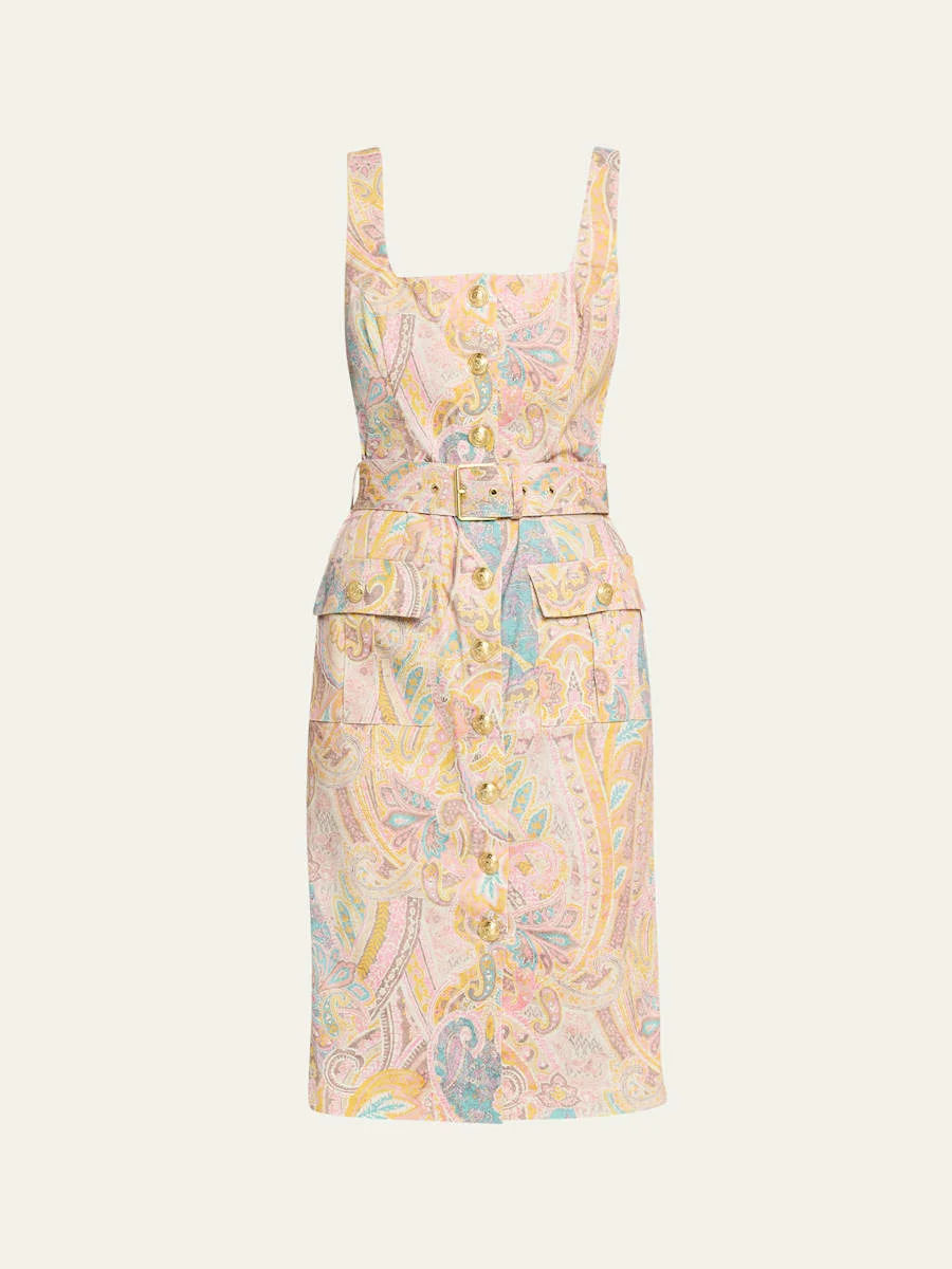 L'Agence "Idy" tank dress in a western paisley print with golden embossed-dome buttons Square neckline Sleeveless Adjustable belted waist Front buttoned flap pockets Hem falls below the knee A-line silhouette Button front closure Cotton/spandex Dry clean Imported Online Inquiries: BGS21_T6N24| Store Inquiries: #5016571