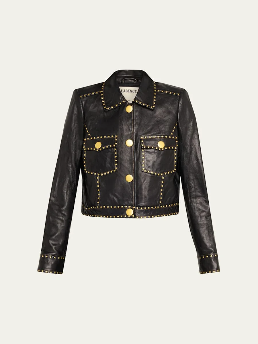 Outlined with gold-tone metal studs, the "Winsome" jacket by L'Agence is crafted from smooth lambskin leather for a structured, sleek and strong silhouette Spread collar; button front Padded shoulders Long sleeves; button cuffs Chest flap pockets Western-style back yoke Relaxed fit Cropped hem Leather Imported Online Inquiries: BGS21_T8RGR| Store Inquiries: #5368522