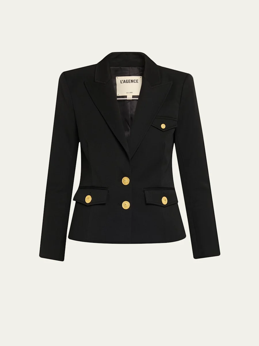 Complete with signature golden embossed-dome buttons, the Wylla blazer by L'Agence offers a structured silhouette Peak lapels Strong shoulders Long sleeves; button cuffs Front buttoned flap pockets Tailored fit Hip length Button front closure Polyester/rayon/cellulose acetate/spandex Dry clean Imported Online Inquiries: BGS21_T6N21| Store Inquiries: #5016568