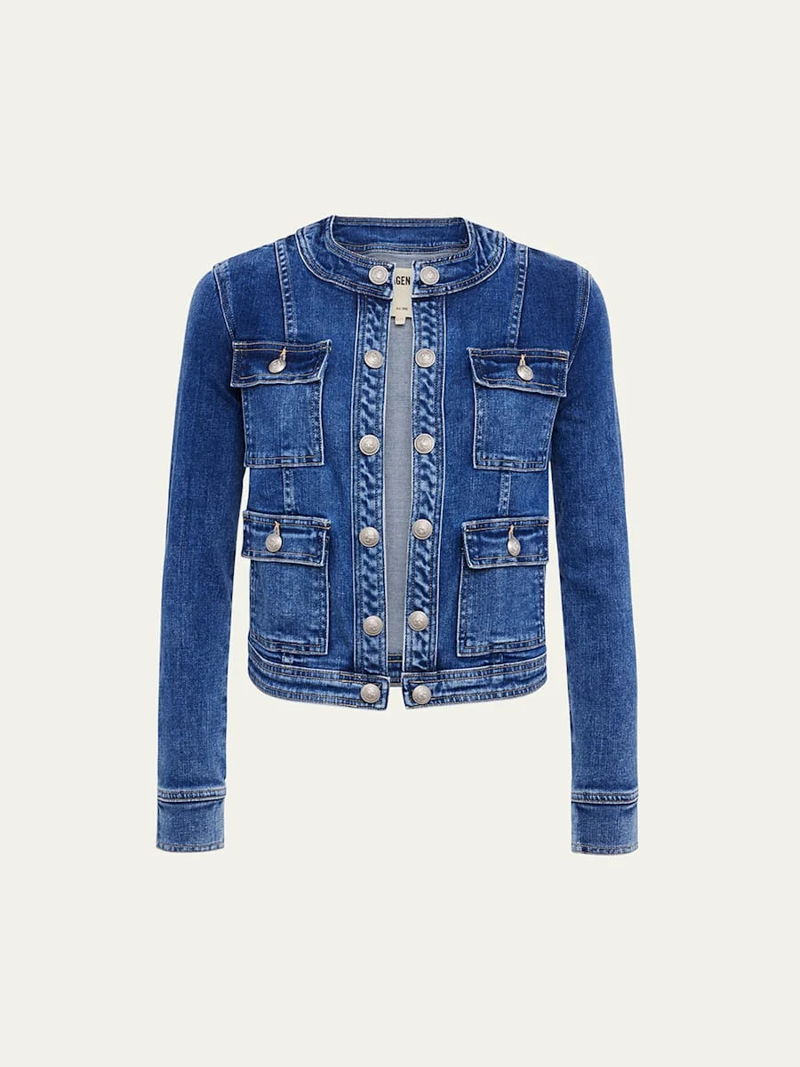 L'Agence "Yari" faded collarless denim jacket featuring silver-toned embossed buttons throughout Long sleeves; button cuffs Front flap pockets Slim fit Open front Cotton/polyester/spandex Dry clean Made in USA Model is 5'10"/177cm. Online Inquiries: BGS21_T5FE8| Store Inquiries: #4328483