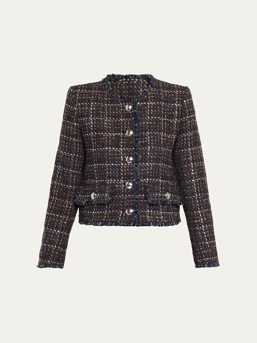L'Agence "Zaya" jacket is crafted from Italian tweed woven with metallic threads of Lurex for a hint of shine Collarless neckline; button front Padded shoulders Long sleeves Hip flap pockets Classic fit Slightly cropped hem Acrylic/polyester/wool Imported Online Inquiries: BGS21_T8S7C| Store Inquiries: #5387548