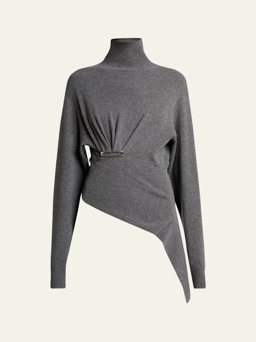 Asymmetric Safety-Pin Gathered Cashmere Turtleneck Sweater