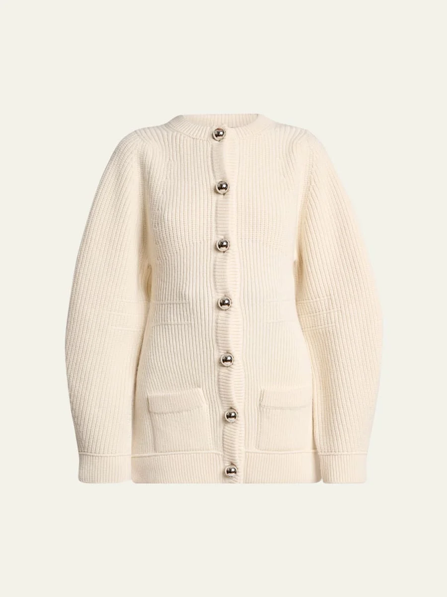 Exaggerated-Sleeve Wool Crewneck Cardigan