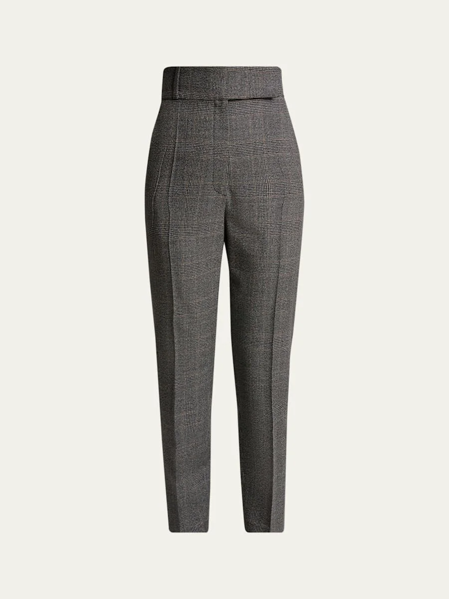 Lanvin cigarette pants are crafted of a check wooln featuring a wide waistband HIgh rise Side split pockets Back welt and button-flap pockets Straight legs Cropped at the ankle Hook-tab/zip fly; belt loops Virgin wool Made in Italy Online Inquiries: BGS21_BB10A| Store Inquiries: #5426334