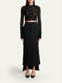 Lanvin cardigan is crafted of a lace open knit Crew neckline; button front Long sleeves Fitted Cropped length Ribbed cuffs and hem Viscose/polyester Imported