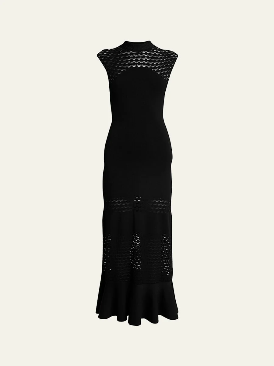 Lanvin dress is knit with lace open knit panels and a ruffle flare hem Round neckline Sleeveless Aline silhouette Full length Slipover style Viscose/polyester Imported