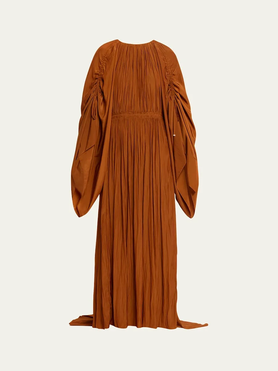 Designed with textural pleating, this dress by Lanvin is framed with voluminous sleeves Crew neckline Long balloon sleeves with adjustable drawstrings Elasticated waistband Full length Aline silhouette Back selfties Polyester Made in Portugal
