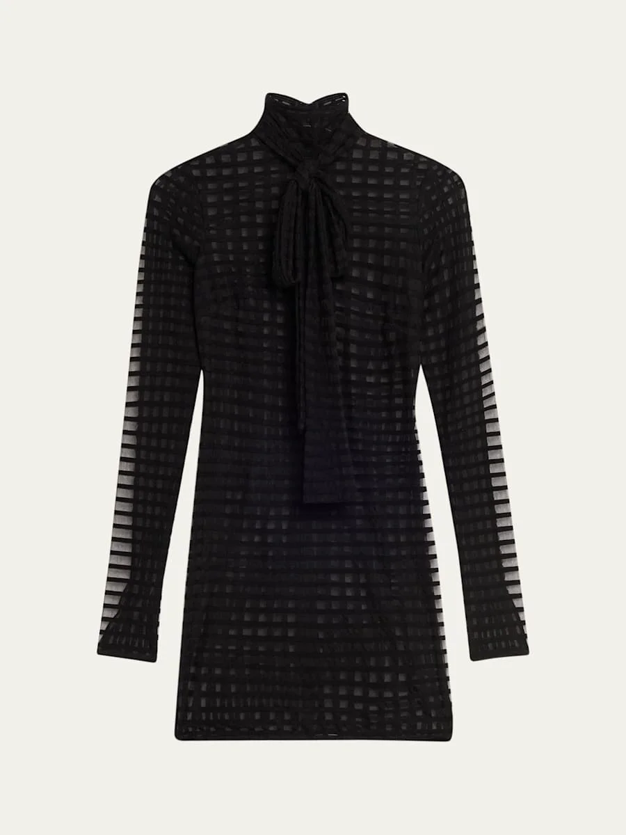 Bow-Neck Sheer Windowpane Long-Sleeve Mini Dress
