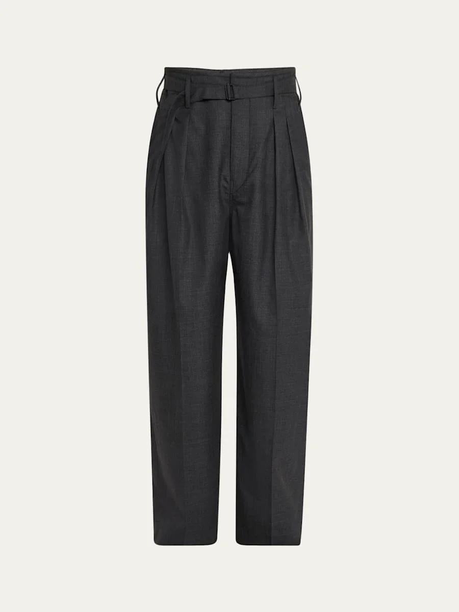 LEMAIRE pants in light tropical wool, woven into a melange twill for a dense yet supple finish High rise Double-pleated front Side slip pockets Jetted back pockets Relaxed fit through straight legs Full length Button-zip front; belt loops Self-fabric belt with metal buckle Cotton/wool Made in Portugal Online Inquiries: BGS21_NCXDF| Store Inquiries: #4970897