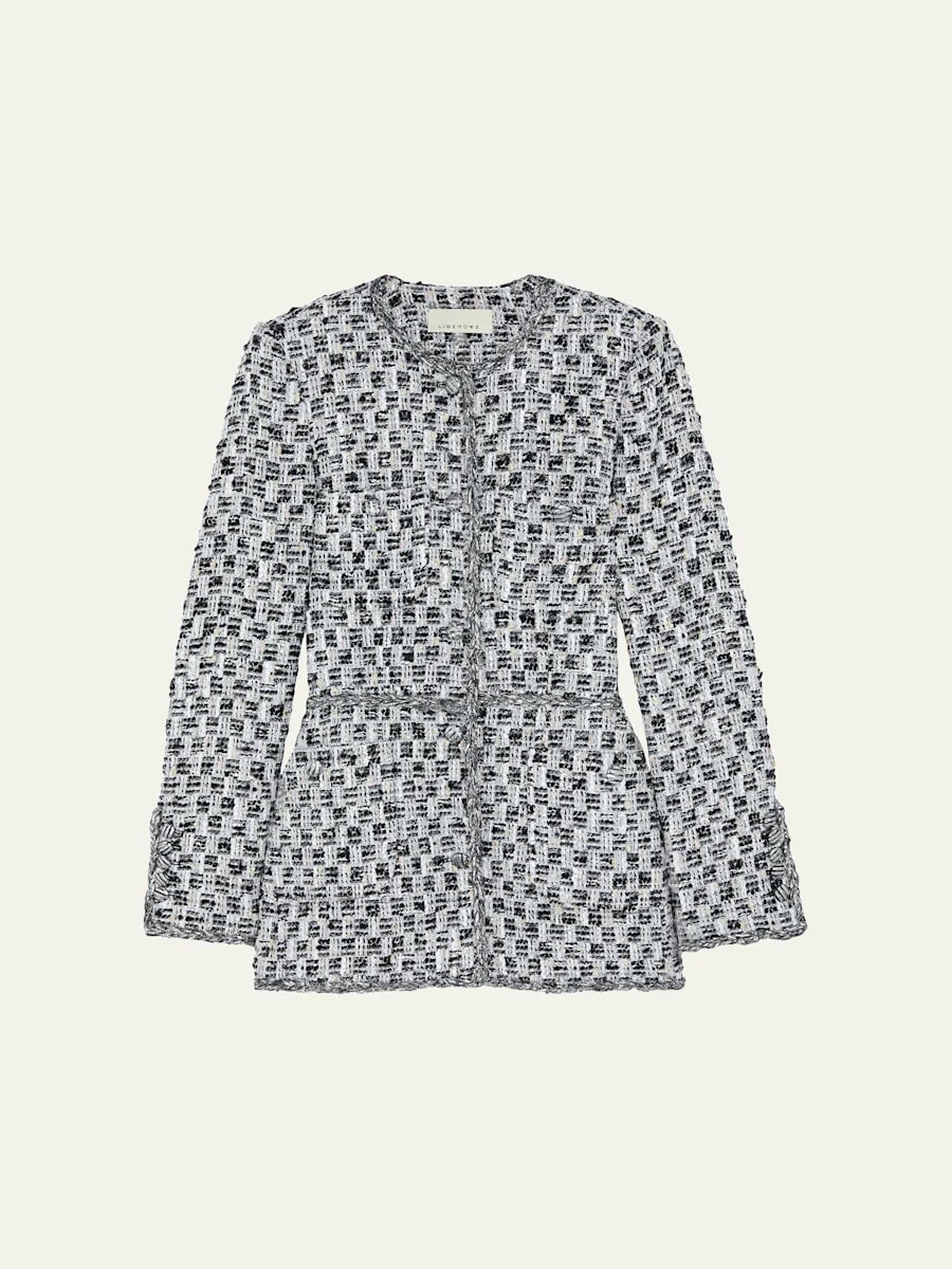 Liberowe "Diya" jacket is crafted from metallic tweed accented with braided edges for added texture and selfcovered buttons Approx. 29"L from shoulder to hem Round neckline; singlebreasted front Long sleeves; approx. 24"L Button cuffs Front buttonpatch pockets Slim fit Hem falls below the hip Cotton/wool/acrylic Lining: Viscose/cupro Dry clean Made in United Kingdom