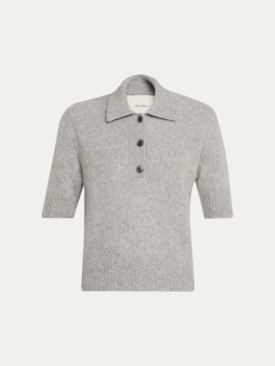 Lisa Yang "Masy" feminine polo shirt knitted from a textured cashmere and silk blend with a featherlight hand 5gg Polo collar; three-button placket Half sleeves Regular fit Slightly cropped silhouette Ribbed cuffs and hem Pullover style Cashmere/silk Dry clean Imported Online Inquiries: BGS21_T6YG3| Store Inquiries: #4931997