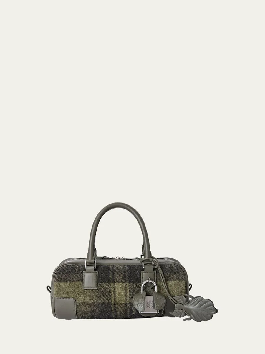 This Loewe "Amazona 23" shoulder bag combines tartan suede with smooth nappa leather, the rounded corners adding a soft touch to the slim silhouette Elevated with insectinspired details: a ladybug padlock and removable leaf bug keychain Rolled top handles Detachable, adjustable shoulder strap Can be worn as a top handle or shoulder bag Twoway zip top closure Interior, one slip pocket Feet protect the bottom of the bag Approx. 4.3"H x 9"W Made in Spain