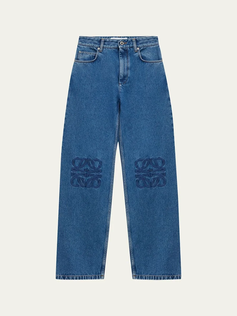 Loewe baggy jeans are crafted from medium-washed denim featuring signature anagram embroidered knees Mid rise sits high on hip Five-pocket style Logo embossed leather patch on the back Wide legs Full length Button/zip fly; belt loops Cotton/leather/polyester Made in Italy Online Inquiries: BGS21_BB4KZ| Store Inquiries: #5488202