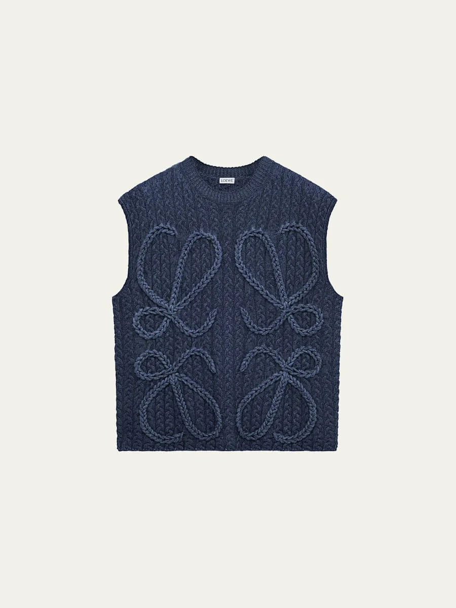 Crafted from woolstretch cable knit, this vest from Loewe features a large anagram braided intarsia on the front Crew neckline Sleeveless Loose fit Hip length Ribbed hem Pullover style Wool/elastane Professional cleaning recommended Made in Italy SIZE amp; FITModel measurements: 5'10" tall Model is wearing a US size 4/Small