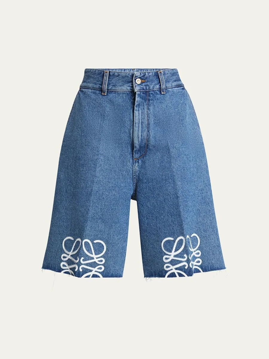 Loewe denim shorts with an anagram detail on the hem and calfskin leather patch Mid rise Straight legs Side slip pockets; back patch pockets Long length Raw edge hem Button/zip fly; belt loops Cotton/polyester, self/lining Dry clean Made in Italy Model is 5'10"/177cm. Online Inquiries: BGS21_B9CTX| Store Inquiries: #4840601
