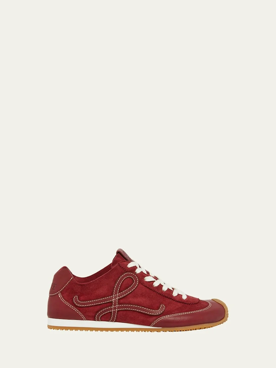 Loewe "Ballet Runner 2.0" low-top sneakers in leather, suede, and polyurethane Lightweight rubber outsole extends to the toecap Flat heel Signature round asymmetrical toe shape Lace-up vamp Embossed Anagram on the tongue Injected rubber logo on the heel tab L monogram appliques Lightweight, sturdy TPU outsole Made in Italy Online Inquiries: BGS21_X6ZK5| Store Inquiries: #5072194