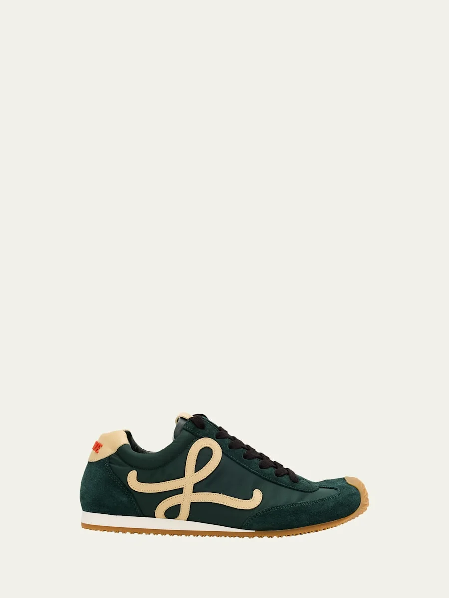 Loewe "Ballet Runner 2.0" lowtop sneakers in leather, suede, and polyurethane Lightweight rubber outsole extends to the toecap Flat heel Signature round asymmetrical toe shape Laceup vamp Embossed Anagram on the tongue Injected rubber logo on the heel tab L monogram appliques Rubber outsole Made in Italy