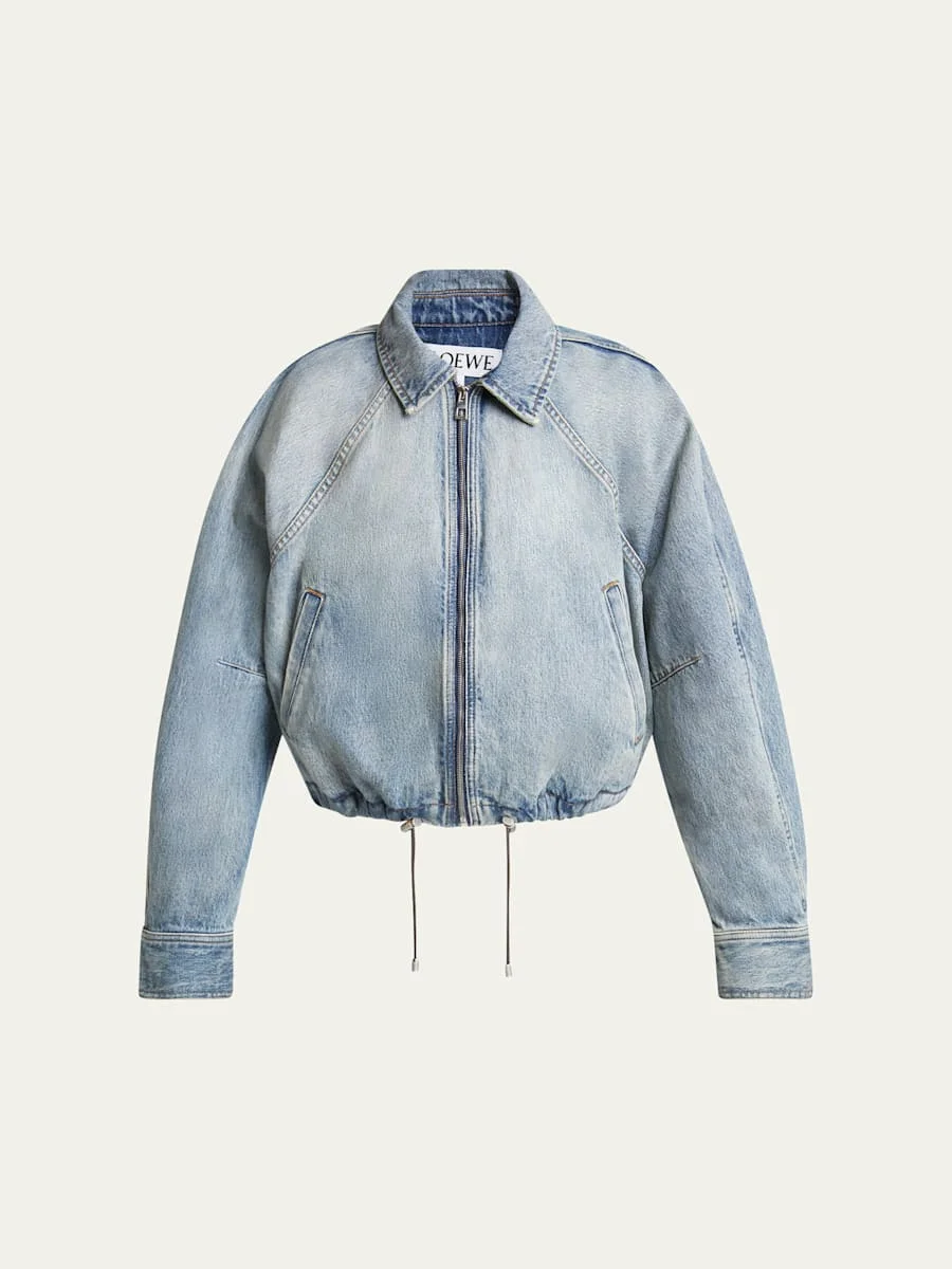 Loewe denim jacket with a lambskin leather label on the back Spread collar; zip front Long sleeves; button cuffs Side pockets Balloon silhouette Cropped length Drawstring hem Cotton Dry clean Made in Italy Model is 5'10"/177cm. Online Inquiries: BGS21_B9MWK| Store Inquiries: #4918629