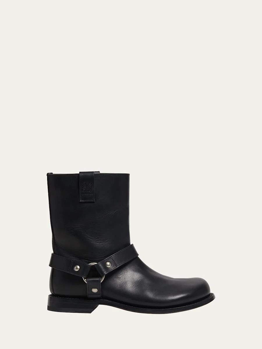 Loewe "Campo" soft leather biker boots with harness accent 1.25 in / 30 mm block heel Round toe Pull tabs at collar Pull-on style Leather outsole Made in Italy Online Inquiries: BGS21_X6N9L| Store Inquiries: #4842045